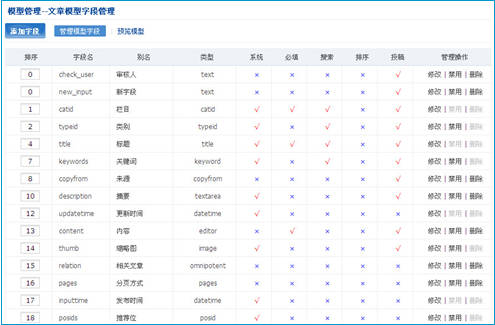 每個(gè)模型都有多個(gè)的屬性,每個(gè)屬性都屬不同的字段類型,我們可以通過模型字段管理來增減字段,并為字段選擇類型,來自定義出自己所需模型,如下圖所示: