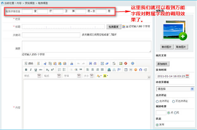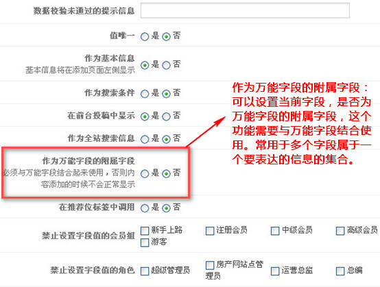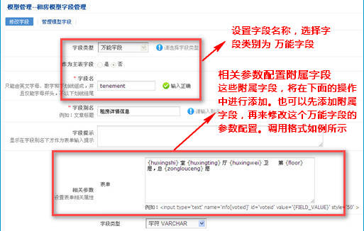 接下來添加萬能字段 tenement 的附屬字段,并在字段設(shè)置中,選擇為萬能字段附屬字段,以戶型室huxingshi為例,其它附屬字段同樣的操作,如下圖所示: