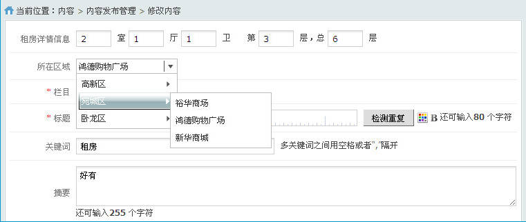 添加完成以后,在模型應(yīng)用欄目,添加信息時(shí),就會(huì)出現(xiàn)聯(lián)動(dòng)菜單選擇框,效果如下圖所示: