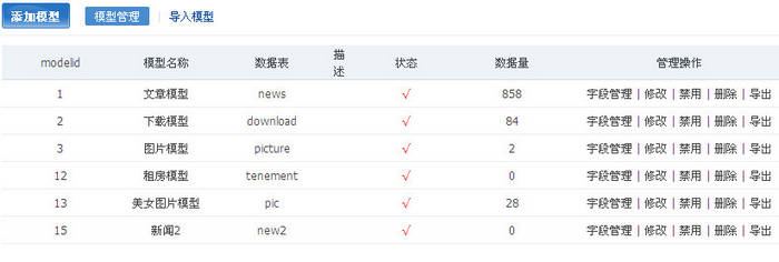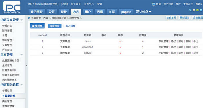 PHPCMS V9 內(nèi)置新聞、圖片、下載三種模型,每個(gè)模型都分別自定義不同的屬性,并可以為模型指定默認(rèn)模版列表。
