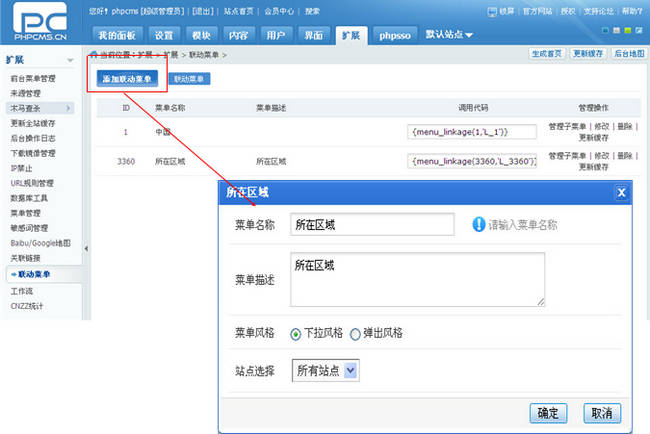 下面我們以為租房模型添加一個(gè)所在區(qū)域聯(lián)動(dòng)菜單為例,說明聯(lián)動(dòng)字段的使用, 首先添加聯(lián)動(dòng)菜單數(shù)據(jù),并選擇菜單風(fēng)格和應(yīng)用站點(diǎn)范圍(V9 支持多站點(diǎn)站群系統(tǒng)),如下圖所示: