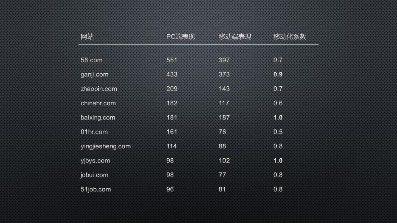 圖中的數值計算方式和前面一樣,統(tǒng)計了一個PC端的相對流量情況,再加了個移動端的。之后再以移動端的數值除以PC端得到移動化系數,這個值越高,就說明對應網站的移動站SEO表現比起自己的PC站來得更好。